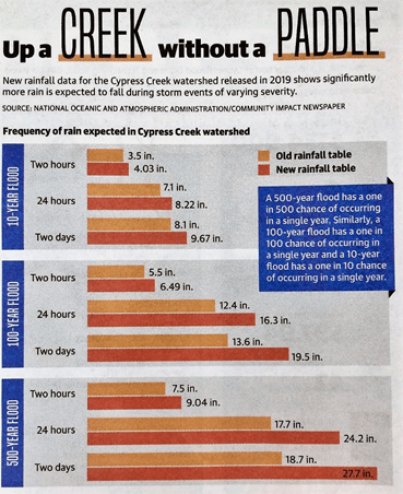 While we have seen Harris County Flood Control (HCFCD) engage in repairs around our watershed, these repairs do not make us more capable of handling floods like the 3 cited above. Even more threatening is the report by NOAA. Their new Atlas 14 forecast for storms indicates exactly what every forecaster has predicted: more storms, more intense storms. For the 100-year storm (1% chance every year) instead of receiving 12.4 inches of rain, we can now expect to receive 16.3 inches. Quite the increase. Buy flood insurance. See the chart by Community Impact Newspaper below: